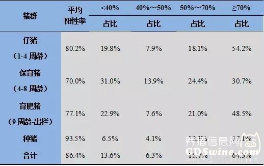 送样进行CSFV抗体检测的目的主要是评价疫苗免疫后效果。2017年上半年,CSFV抗体的总阳性率为86.6%。对有明确的背景信息的样品进行统计,阳性率为86.4%。表明猪瘟抗体水平稳定,处于免疫合格范围内;其中仔猪与种猪的平均阳性率高于其他阶段的猪群,保育猪和育肥猪在 阻断率≥70% 的区间内所占的比例明显低于其他阶段。从猪瘟疫苗免疫阴性猪的抗体上升情况看,原因可能为首免甚至二免时,因母源抗体较高,由于受母源抗体干扰,抗体呈现不升反降,仔猪与种猪平均阳性率较高的结果也从另一侧面佐证了这一点。因此,对于这样的场,我们会提醒其关注免疫程序的合理性,通过持续监测调整免疫程序,提高群体免疫效果。