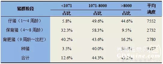 对使用BioChek试剂盒检测的结果进行了统计,阳性率为87.7%。对有明确背景信息的样品检测结果进行了统计,阳性率为87.4%,结果见表6。结果显示,有43.2%的样品gB抗体滴度在8000以上(伪狂犬感染预警值),说明伪狂犬的感染在猪群中仍然非常普遍。另外,不同阶段猪群中,滴度处于1071~8000的样品比例均未超过60%,说明伪狂犬疫苗的免疫未达到理想效果。
