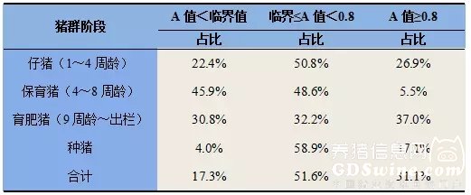 对使用普莱柯万泰PRV gB试剂盒检测的结果进行了统计,阳性率为76.3%;对有明确背景信息的样品进行了统计,阳性率为82.7%,结果见表7。结果显示,对于不同阶段的猪群,其A值处于临界值~0.8范围(正常免疫抗体)的样品所占的比例均未超过60%,说明伪狂犬疫苗的免疫效果并未达到理想水平。而在 A值≥0.8 (即猪伪狂犬病感染预警值)范围内,种猪与育肥猪的比例均在35%以上,说明育肥猪和种猪中的伪狂犬感染的风险仍然很大。