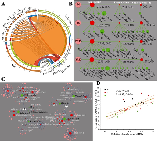 本论文采用宏基因组测序和生物信息学分析,研究了肉鸡在饲用金霉素后,粪便中菌群结构的变化、耐药基因及其宿主菌的迁移规律。结果表明,肉鸡粪便中主要的耐药基因依次是多重耐药类、氨基糖苷类、四环素类和磺胺类耐药基因。携带这些耐药基因的主要菌属依次是Escherichia、Klebsiella、Shigella和Salmonella。肉鸡饲喂金霉素后,粪便中四环素类抗生素耐药基因如tetA和tetW的丰度显著升高,多重耐药基因如mdtA、mdtC和mdtK的丰度显著降低。其中多重耐药基因的丰度降低的主要原因是Escherichia减少。给予治疗剂量的金霉素后,氨基糖苷类抗生素耐药基因的宿主从Escherichia迁移至Klebsiella。